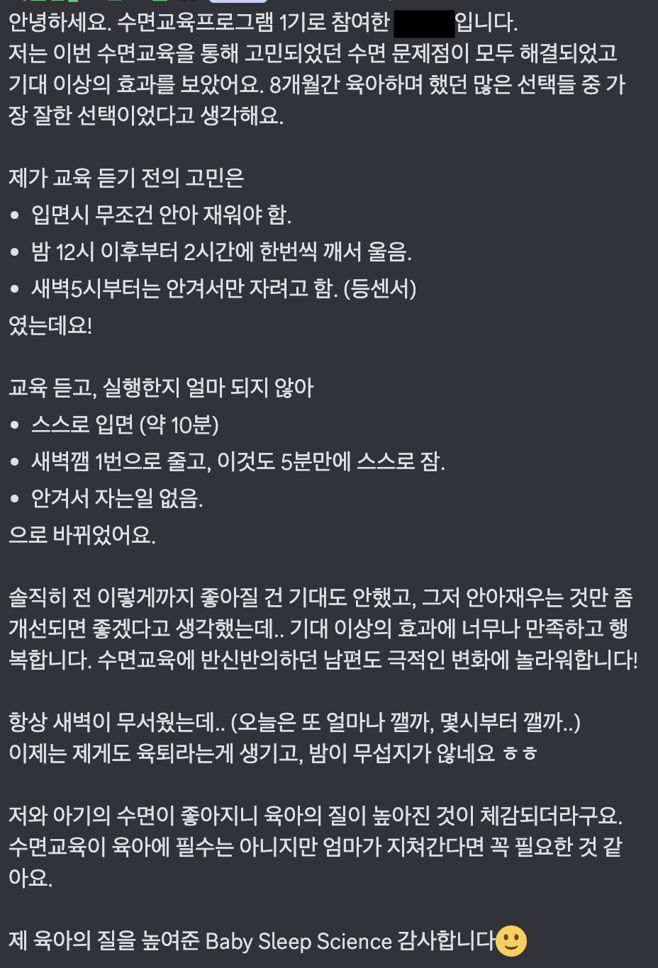 수면교육에 대한 막연한 두려움도 사라졌습니다.
