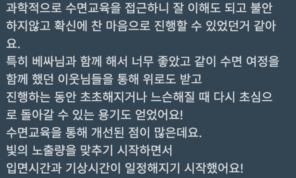 현실 적용을 돕기 위해 수면컨설턴트님의 코칭을 제공하며,